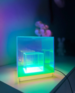 Gracias a su estructura cúbica y transparente, esta luminaria proyecta un efecto visual único, bañando el entorno con matices que van desde el cian eléctrico hasta el magenta profundo. Es ideal para quienes buscan un toque "tech" o artístico sin sacrificar la elegancia.